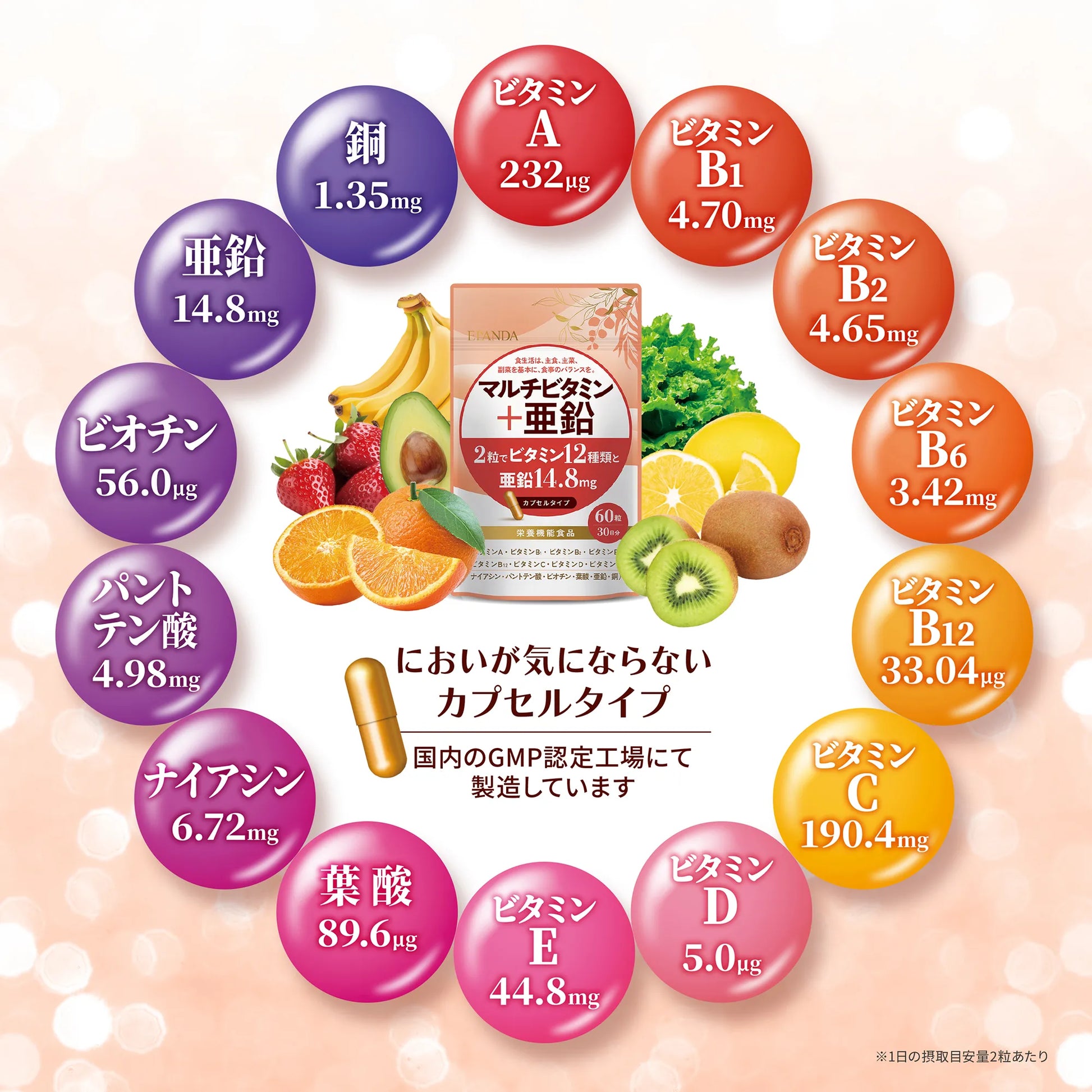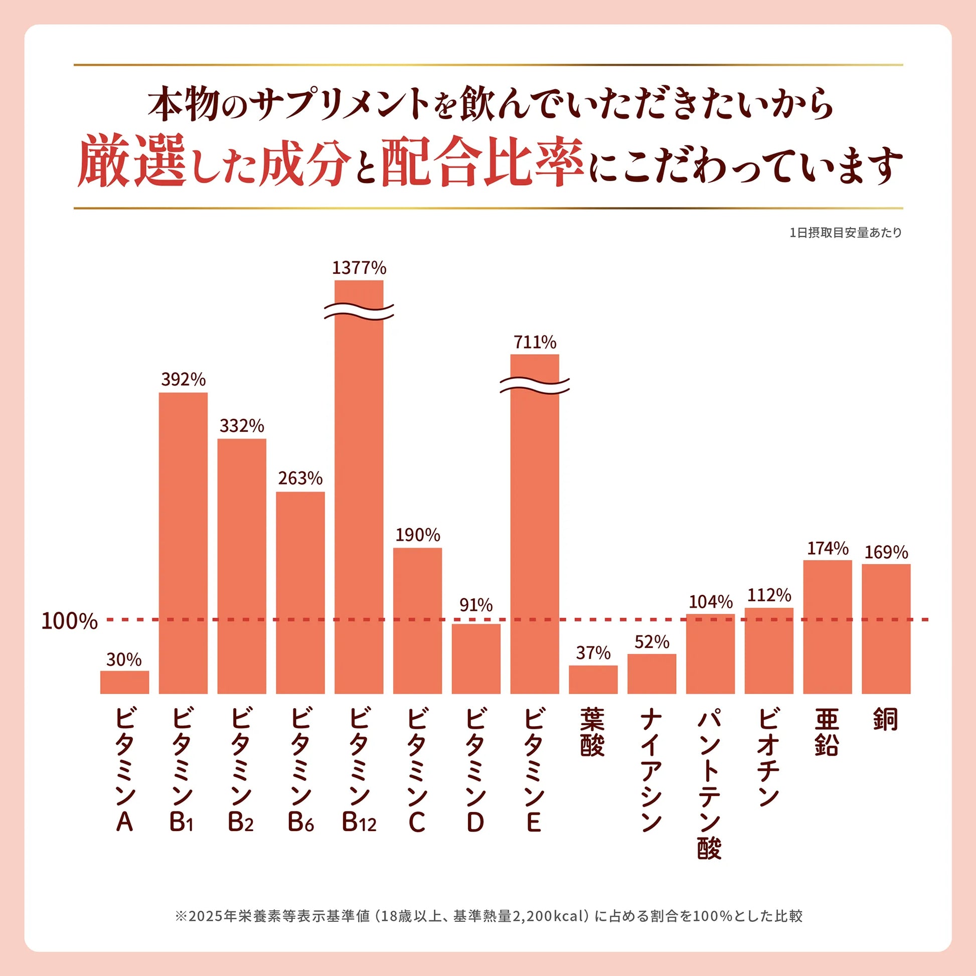 ✓食事で不足しがちな1日分のビタミン12種類と亜鉛、銅が2粒で補える