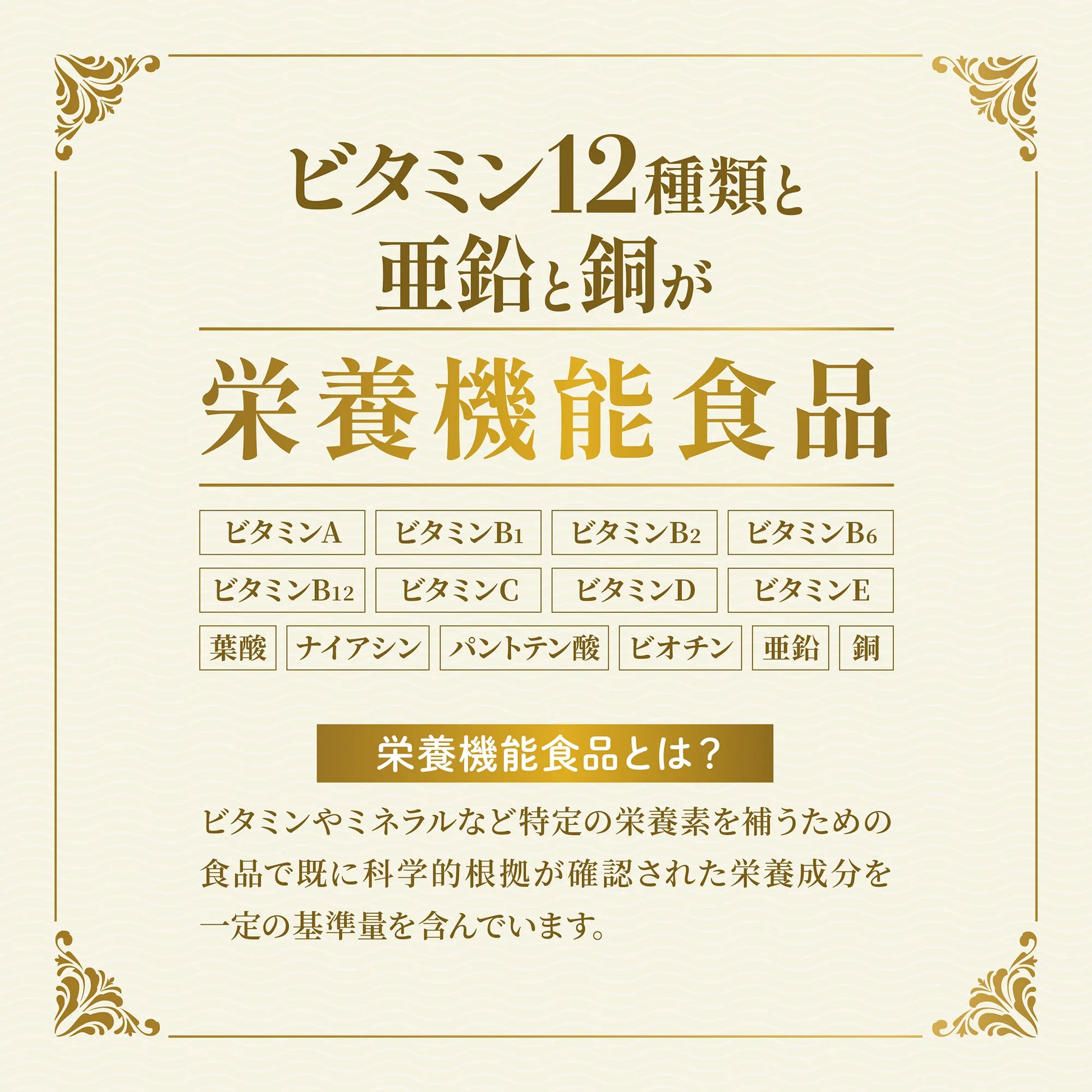 【12種類のビタミンをバランスよく配合】ビタミンK以外の主要ビタミンを幅広く含み、栄養バランスをサポート。さらに栄養機能食品としてビタミン12種類と亜鉛、銅が国で定めた一定の基準量を配合しています。